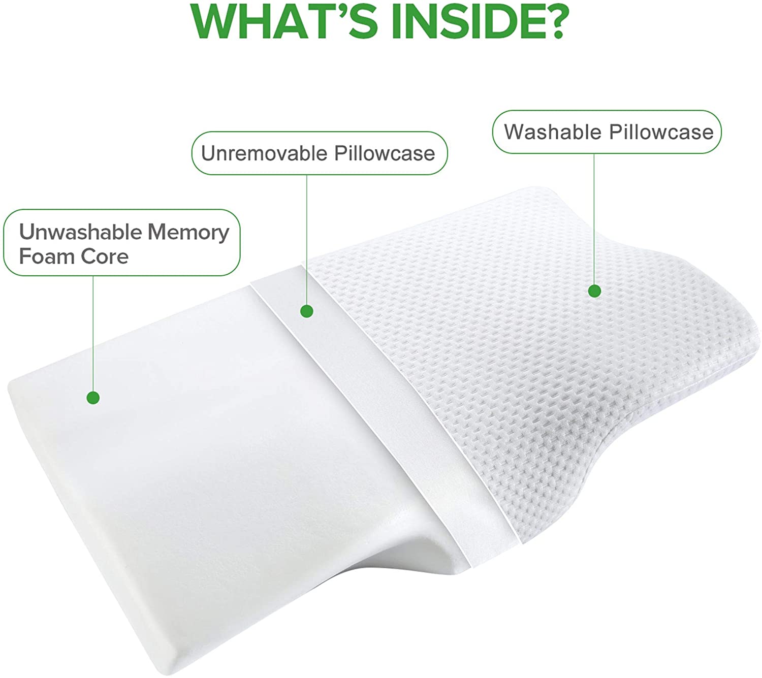 Ergonomic design will relieve neck and shoulder pain by distributing your body’s pressure evenly. It’s a little bit firm. Lying on your back or side lying will be comfortable. The adjustable attic, the pillow is originally 4.5 inches (high profile) and 2.9 inches (low profile), removes the middle memory foam layer, you get the perfect head groove to make the cervical vertebra to maintain the straight line, so that it will help you reduce embarrassing snore.